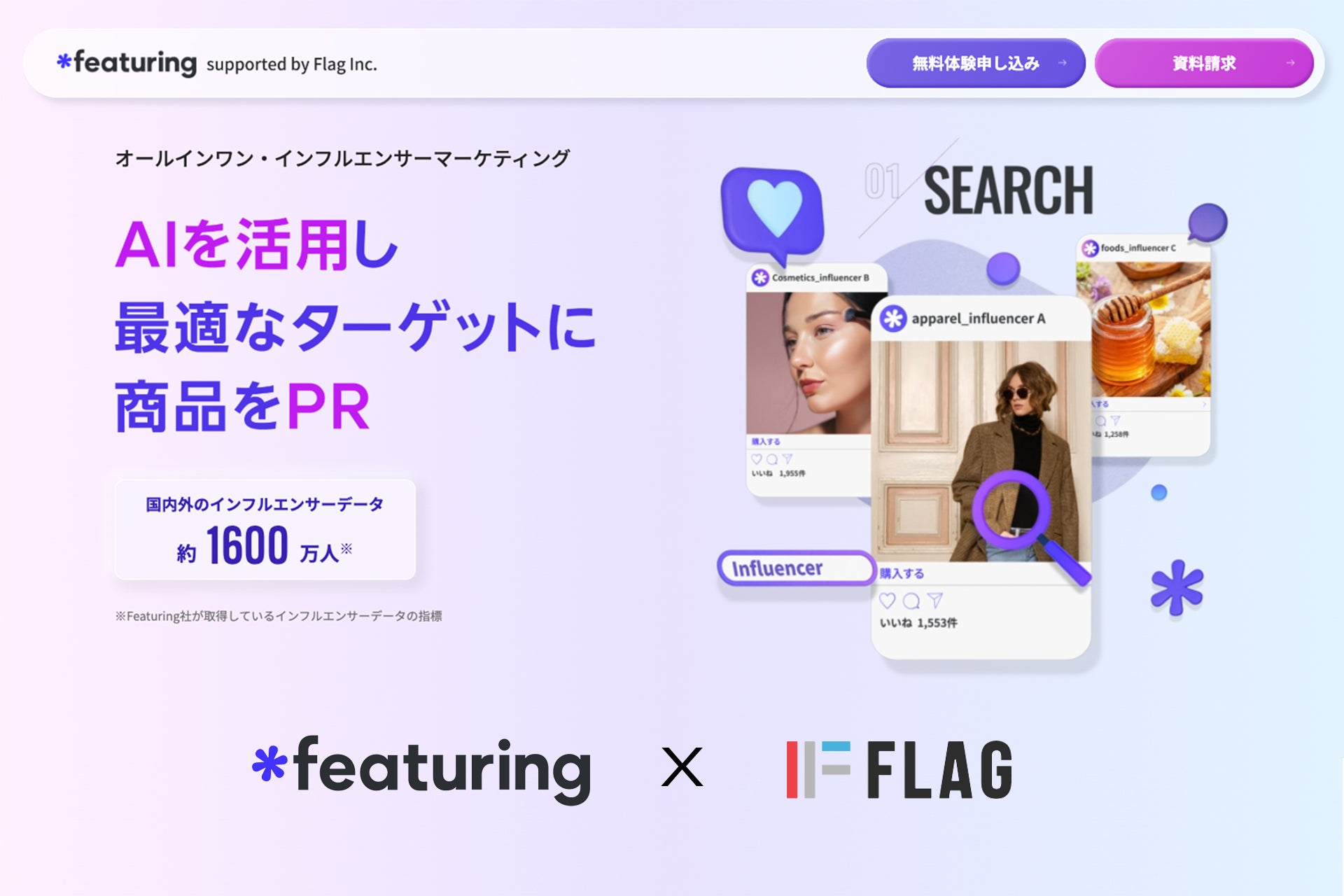 マーケティングコミュニケーションの総合プロデュースを担う株式会社フラッグ(本社:東京都渋谷区、代表取締役:久保浩章、以下、当社)は、インフルエンサーマーケティングサービスを提供する韓国企業「フィーチャリング社」(代表:チャン・ジフン)と共同で、AIを活用したオールインワンインフルエンサーマーケティングソリューション「featuring」の日本版サービスを2024年12月10日より提供開始いたします。
