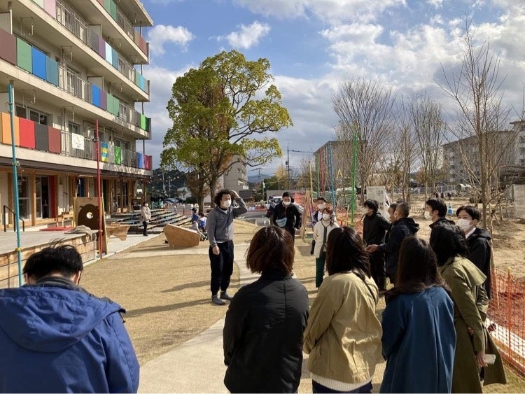2021 年5 月、解体予定だった団地棟のうち1 棟を、地域の会話を増やす装置としてリノベーションした「ひのさと48(※1)」がオープン。約1 年間、地域の方々とさまざまな対話をし、おせっかいくらいに深く関わりながら、たくさんの試行錯誤を積み重ねる中で、当初の予測を裏切るおもしろいイノベーションが起こっています。経済の成長が飽和し、価値観や生き方が多様化する時代の中で、企業や行政のあり方にも複雑な変化が求められ、今まさに全国の組織の中でさまざまな試行錯誤がおこなわれています。そんな方々に向けて、ここで得られたプロセスやナレッジを共有することで再現性を示唆し、いっしょに課題に取り組む場をつくることが、広く社会貢献になるのではと考えました。そんな想いで開講するのが、この「ひのさと48 ビジネスキャンプ」です(写真は視察時の様子)。