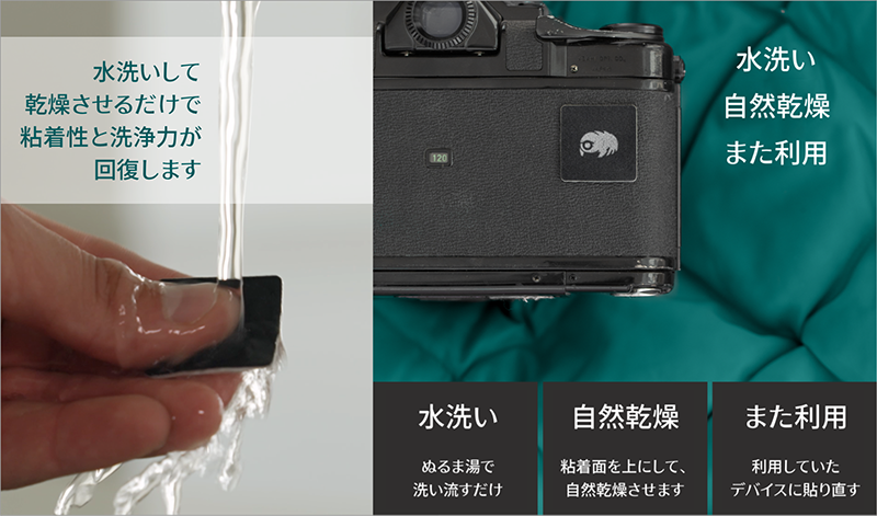 - 粘着力や汚れが気になり出したら水洗い+自然乾燥で繰り返し使える、最強生物クマムシにも負けない