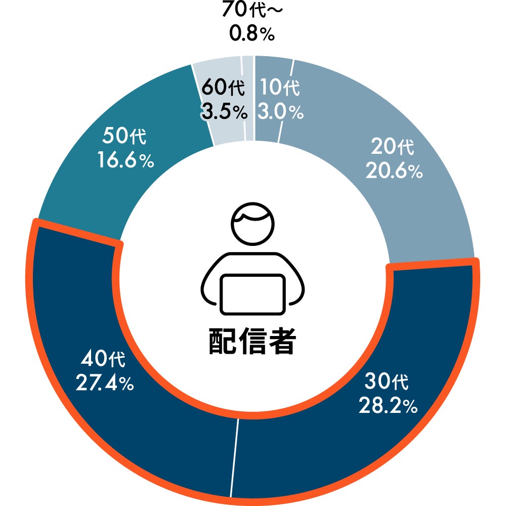 若者の利用者層が多いと思われがちなライブ配信業界ですが、「ふわっち」は2015年にサービスを開始して以来、幅広いユーザーに利用されています。2024年9月に行ったユーザー調査では、30~40代の配信者が約55.6%を占め、30~40代の課金者(視聴者)が約56.3%を占めています。若者だけではなく、老若男女に利用されているのが他のライブ配信サービスとは異なる「ふわっち」の特徴です。
