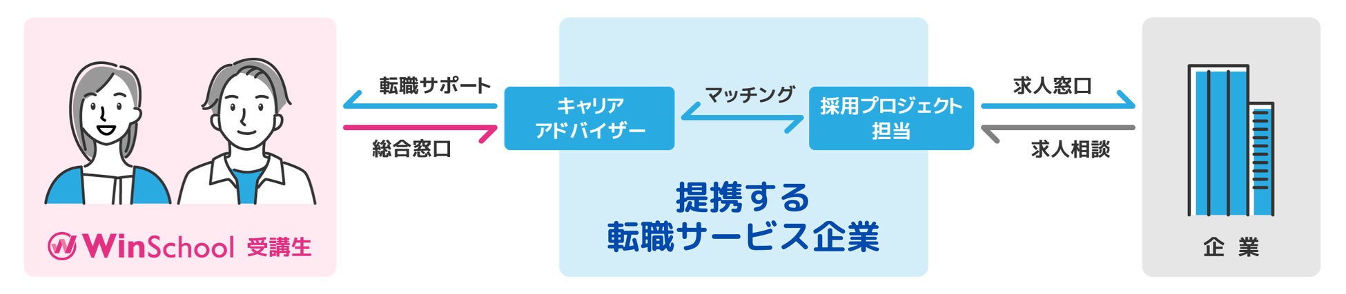 Winスクールはこれまで、IT・DX・クリエイティブ・CADなどの専門スキルを学び、キャリアアップを目指す方を支援してきました。今回の提携により、学んだスキルを活かして転職するまでの流れを、よりスムーズに進められる環境を提供します。