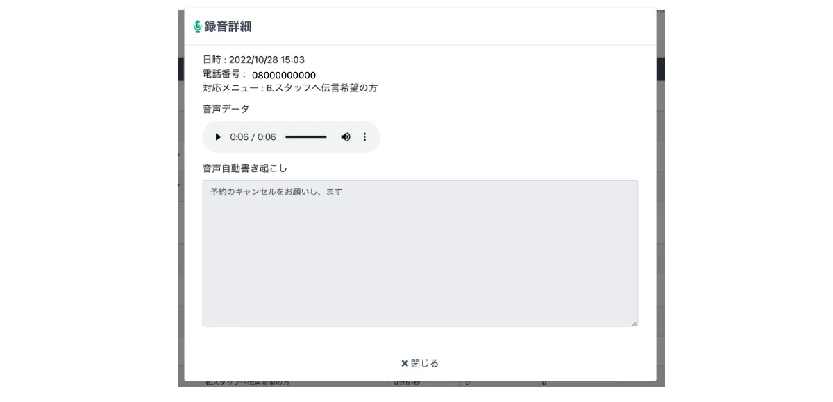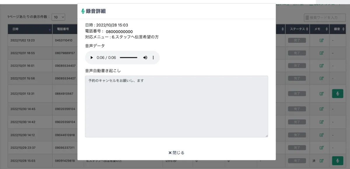 患者に伝言を残してもらうメニューを設定でき、留守録のように使えます。 録音された音声データは自動でテキスト化され、アイバーの管理画面上で文字で用件を確認できます。