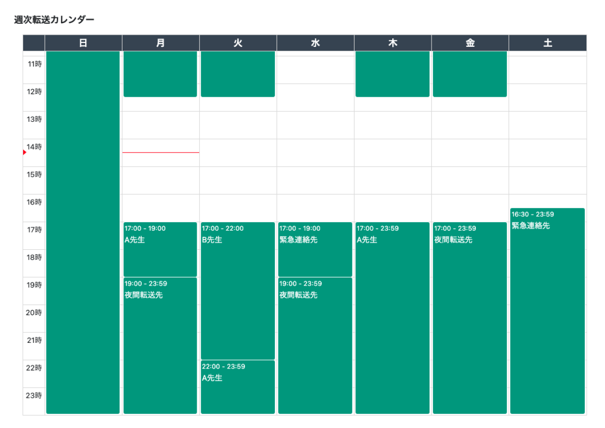 患者には1つの電話番号を案内し、曜日によって転送先を振り分けることができます。複数のスタッフがシフト制で夜間対応を行うことが可能になります。また、転送パターンをとして複数の電話番号を設定できることで、1人の医師が電話がつながらなかった場合でも、ほかの医師に自動的に転送されるため、患者からの緊急連絡を取りこぼさずに対応できるようになります。
