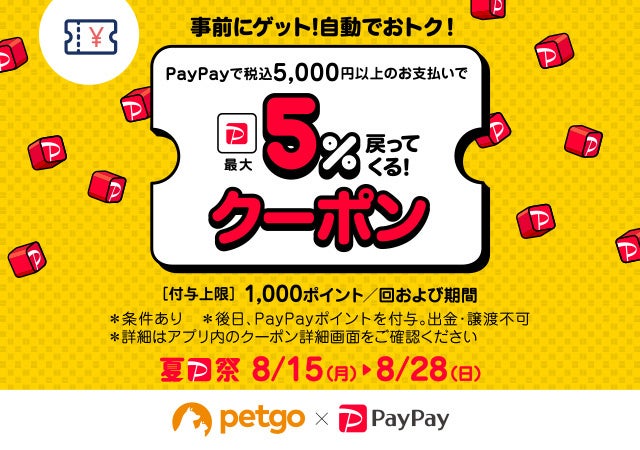 ペットゴー株式会社(本社:東京都中野区、代表取締役社長:黒澤弘、証券コード:7140、以下「当社」)は、当社が運営するペットヘルスケア通販サイト「ペットゴー(petgo.jp)」にて、2022年8月15日よりPayPayクーポンキャンペーンを開催いたします。