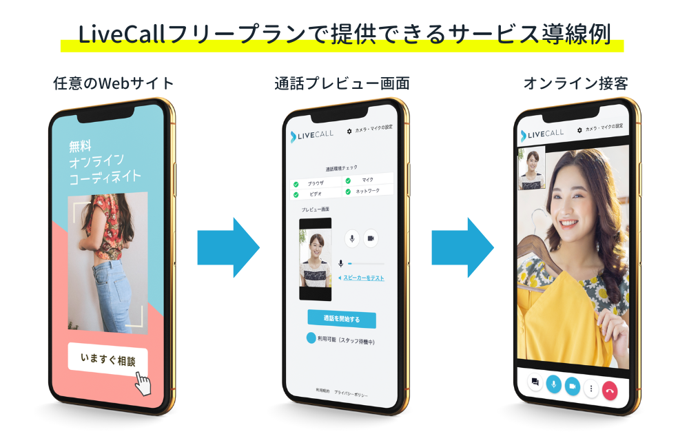 そこで、LiveCallは、オンライン接客導入のハードルを下げより、多くの企業にオンライン接客をご活用いただくべく、無料プランの提供を開始いたします。無料プランでは、これまで有料プランでのご提供に限られていた即時通話機能(ワンクリックで音声/ビデオ通話に接続しその場でスタッフに相談ができる機能)などを利用いただけ、シンプルな操作と設定のみで即日オンライン接客の提供が可能となります。