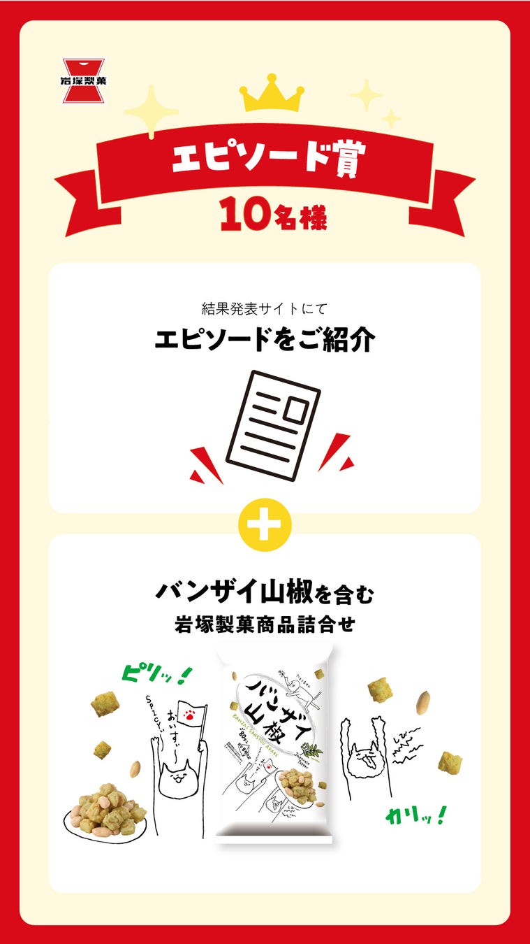 結果発表サイトにてエピソードのご紹介& バンザイ山椒を含む岩塚製菓商品詰め合わせ