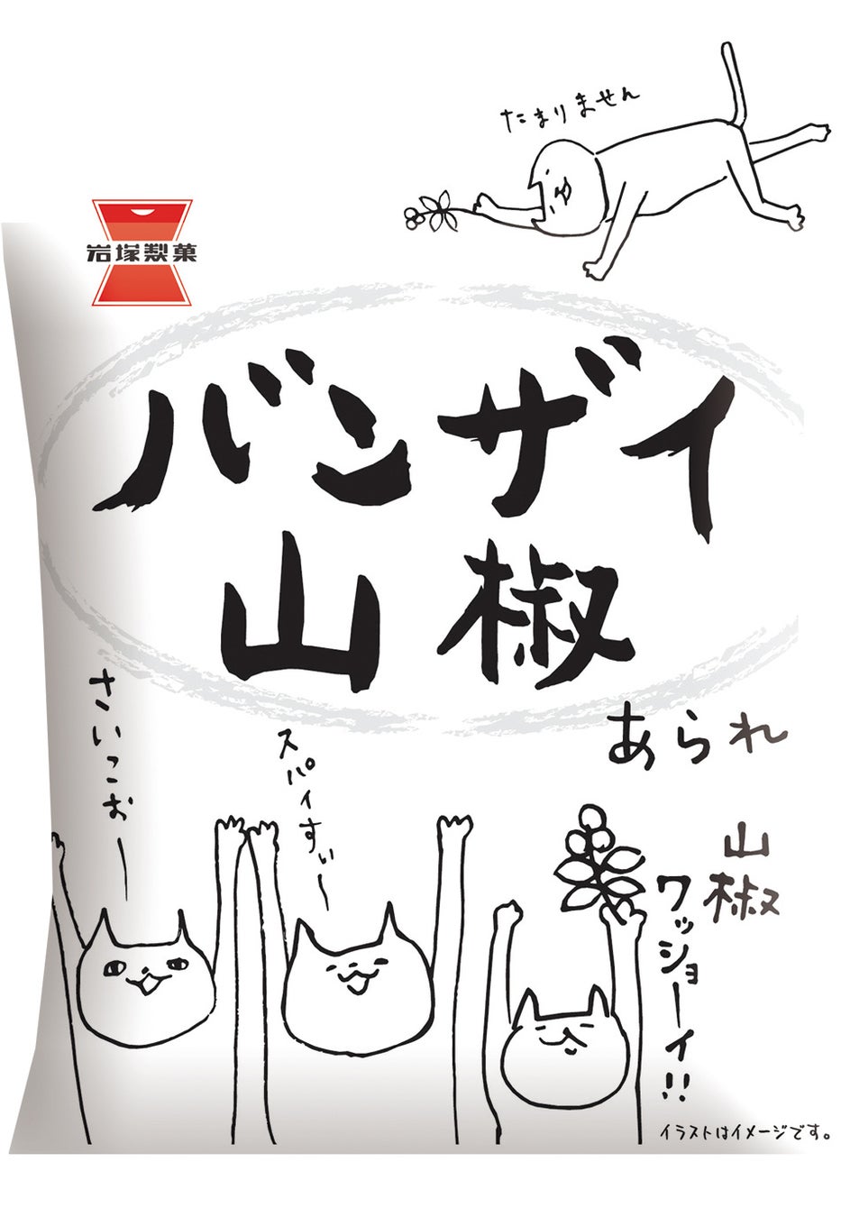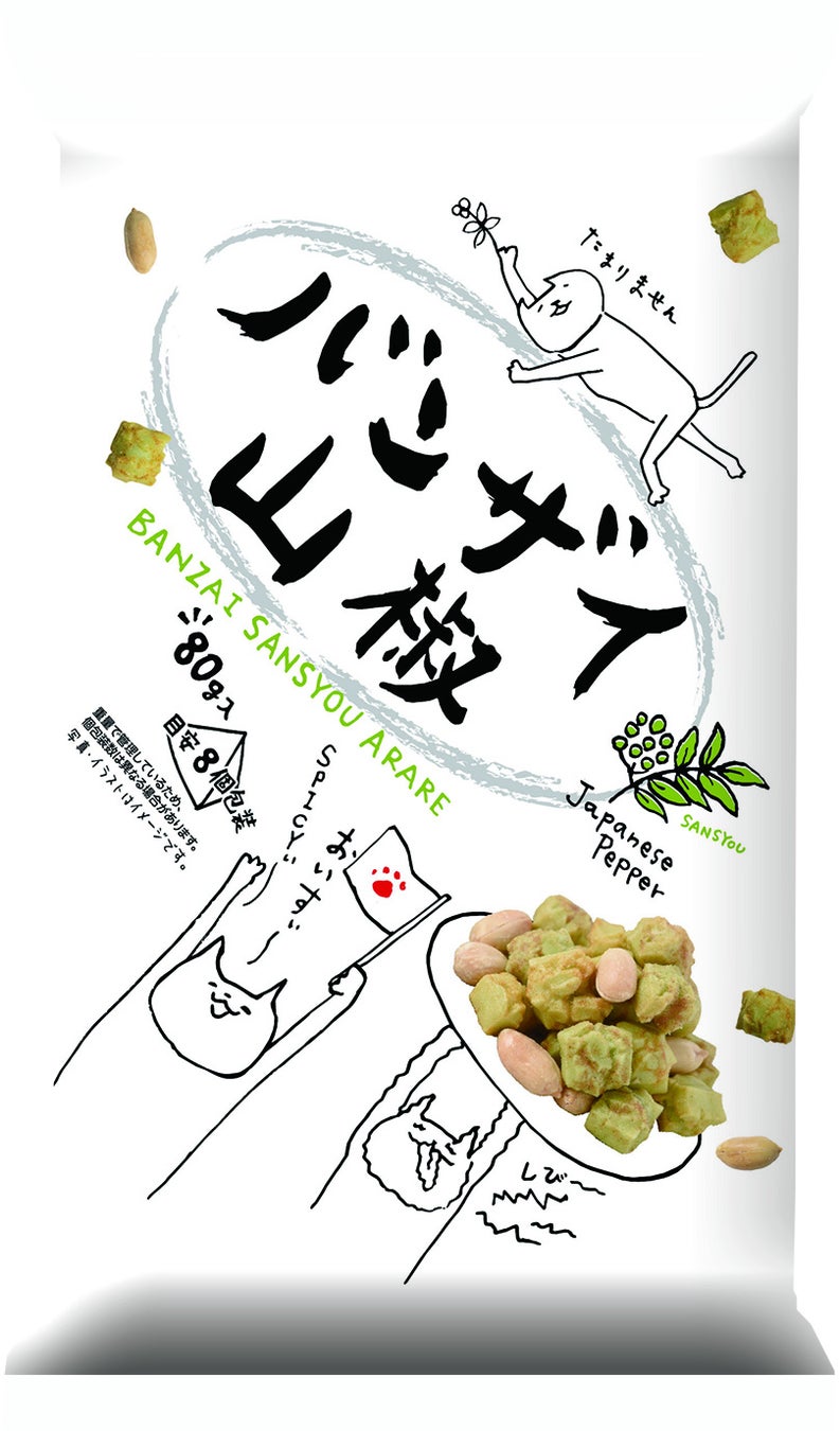 2018年より販売している、ゆるかわいいネコのようなキャラクターのパッケージに山椒のしびれがクセになるカリッと食感の小粒あられです。