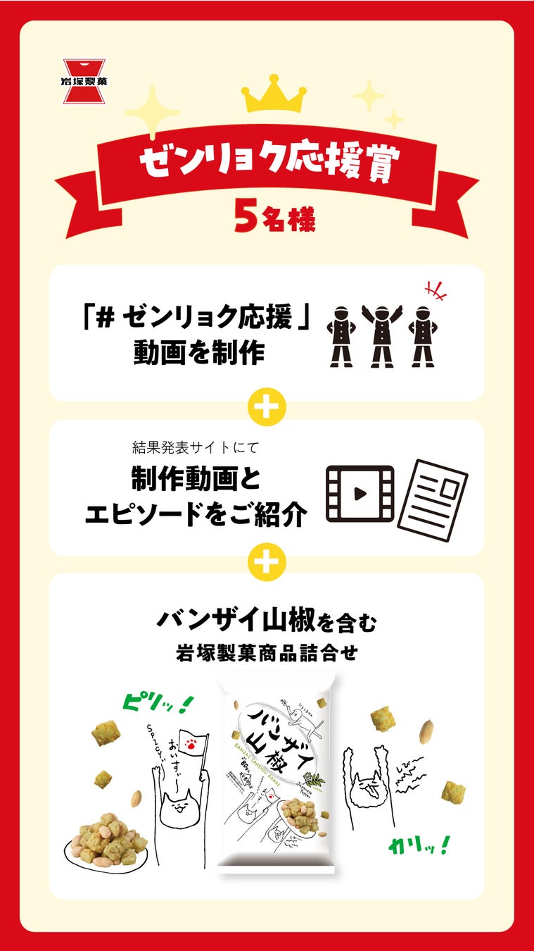 結果発表サイトにて動画とエピソードのご紹介& バンザイ山椒を含む岩塚製菓商品詰め合わせ