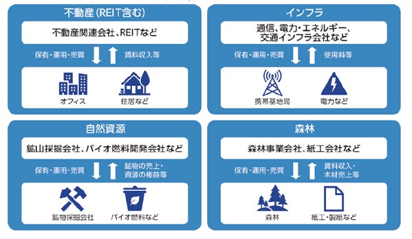 リアル資産とは、不動産、インフラストラクチャー、自然資源、森林といった実物資産を有する企業が発行する株式をいいます。これらのビジネスは、相対的に参入障壁が高いといった特徴があります。また、インフレ局面においては、保有する資産価値の上昇が期待され、インフレに対応できる資産としても注目されます。リアル資産に関する詳しい情報は、下記ウェブサイトで入手することができます。