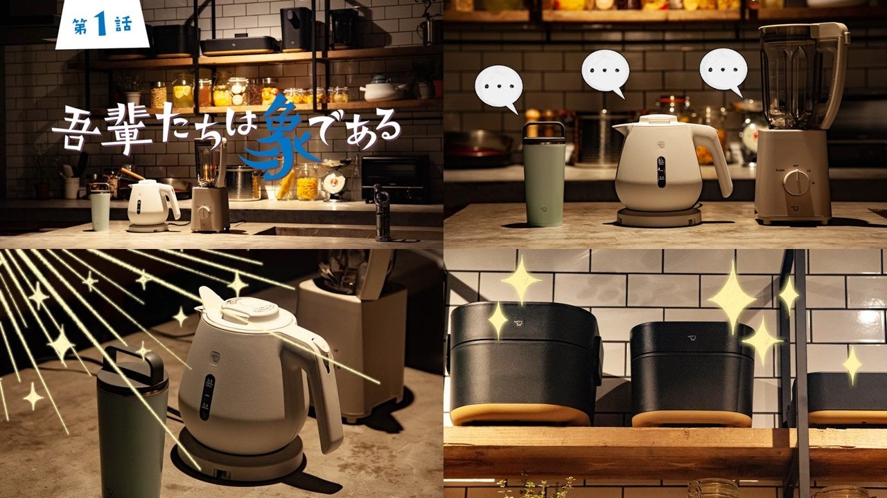 概要:物語はいつも、とあるキッチンの片隅から始まります。主役は ZOJIRUSHI の文字ロゴがなく 「象」のマークだけがワンポイントでついた「象さん印」のキャリータンブラーちゃん、ミキサーさん、ケトルくん。3人が織りなす、ささやかで平和(?)な日常のひとコマをお楽しみください。