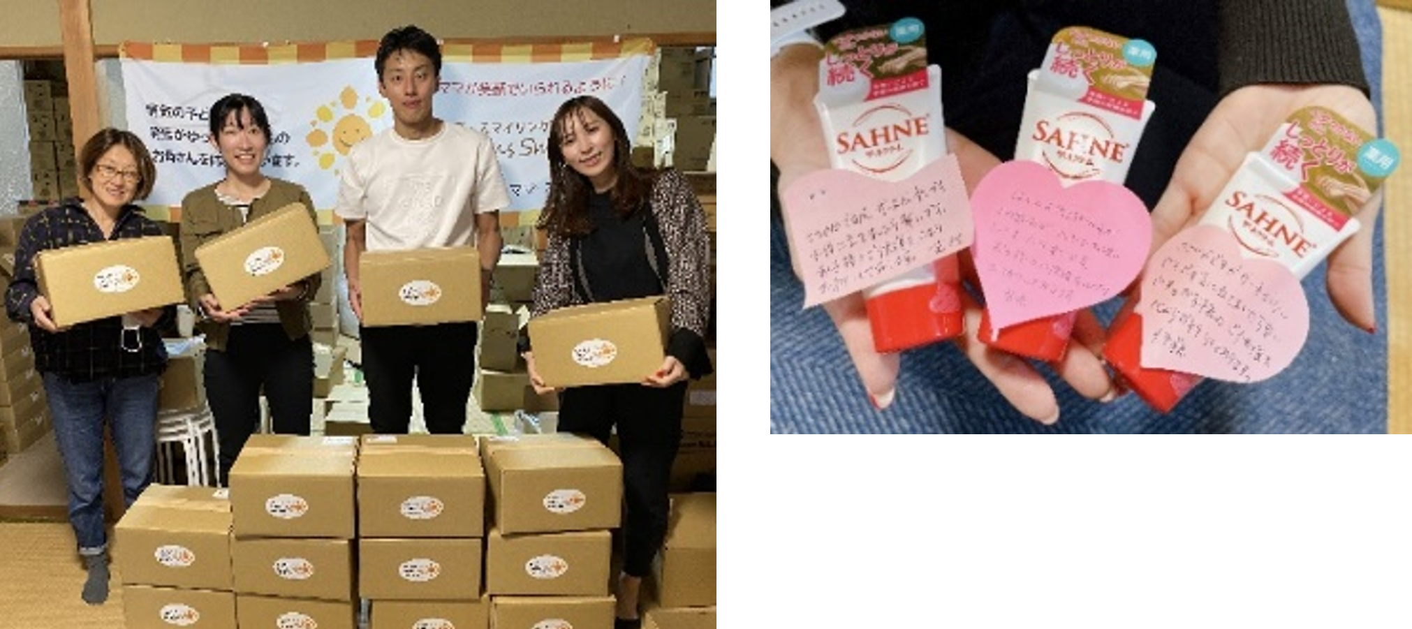 エーザイでは、ささやかであっても「ご家族に笑顔になっていただきたい」との思いから、キープ・ママ・スマイリングが全国の子どもの長期入院に付き添うご家族に配布している「付き添い生活応援パック」へのザーネクリームの提供、コンシューマー事業に携わる社員たちによるパック詰め作業のボランティア等の支援を続けています。