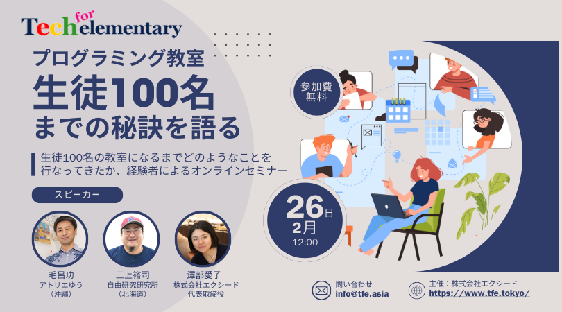 プログラミング教室「Tech for elementary(以下TFE)」を運営する株式会社エクシード(本社:東京都渋谷区、代表取締役:澤部愛子)は、地方でプログラミング教室の生徒を100名になるためのセミナーを開催します。