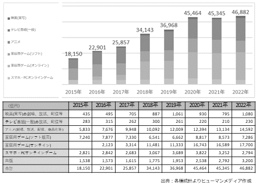 映画(実写)とテレビ番組(一般)の規模は小さい。映画(実写)は2019年まで拡大、2020年、2021年にはコロナ禍の影響で減少、2022年に大きく伸び、回復を見せた。テレビ番組(一般)も2018年には2012年の倍の規模になったが、2020年、2021年に減少、2022年は回複傾向になった。