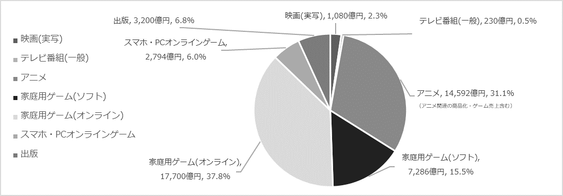 ・アニメは、日本動画協会「アニメ産業レポート」の海外市場売上の数値で、劇場・放送・配信等の映像売上の他、アニメ関連の商品、アニメキャラクターを使用したゲーム売上等も含まれている。