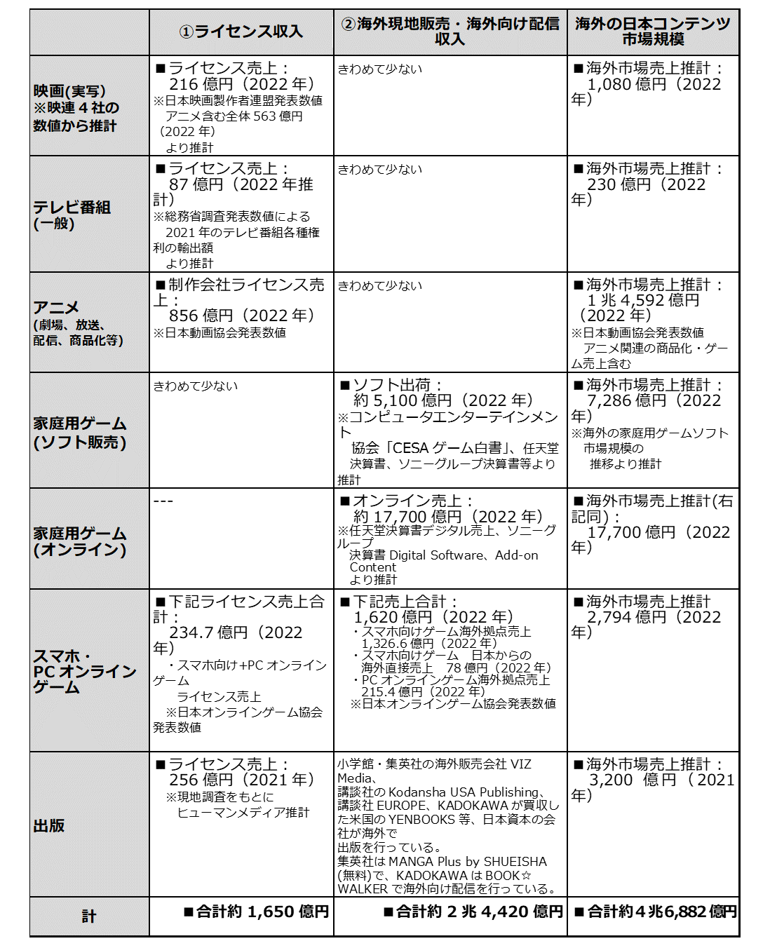 ・映画(実写)は、日本映画製作者連盟加盟4社(松竹、東映、東宝、角川)の海外への映画輸出実績(映画・テレビ映画の海外配給権、海外上映権、リメイク権、海外放送権、海外二次利用権、映画・テレビキャラクター商品化権)から、アニメと重複する加盟社の子会社の海外収入を差し引いて推計した。