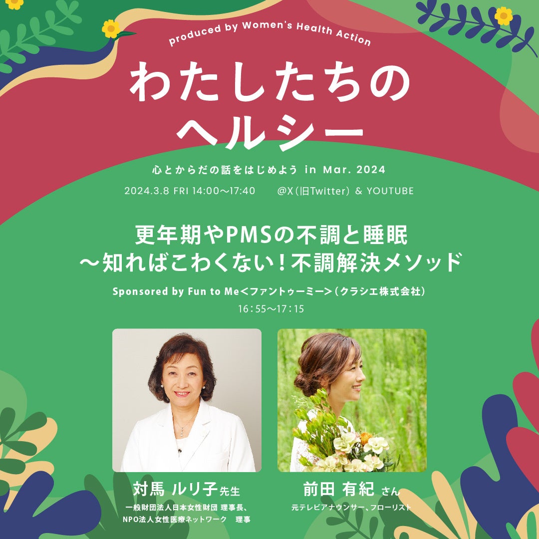 クラシエの「Fun to Me」は、おとな女性の悩みを対処するため、個別のバランス状態をチェックし、一人一人に合った「食」と、セルフケア方法などの「情報」をお届けするサブスクリプションサービスです。この度、Women’s Health Actionが目指す「女性が健やかに輝きつづけることが出来る社会の実現」に賛同し、協賛を決定いたしました。本イベントで実施する、対馬ルリ子先生(一般財団法人日本女性財団 理事長、NPO法人女性医療ネットワーク 理事)と、前田有紀さん(元アナウンサー、フローリスト)のトークセッション「更年期やPMSの不調と睡眠 ~知ればこわくない!不調解決メソッド」に参加し、更年期症状を含めたおとな女性ならではの不調に対する悩みへの向き合い方について、特に、「睡眠」にまつわる問題にフォーカスしてご紹介いたします。ここだけでしか視聴できないスペシャルトークセッションとなっておりますので、ぜひご覧ください。