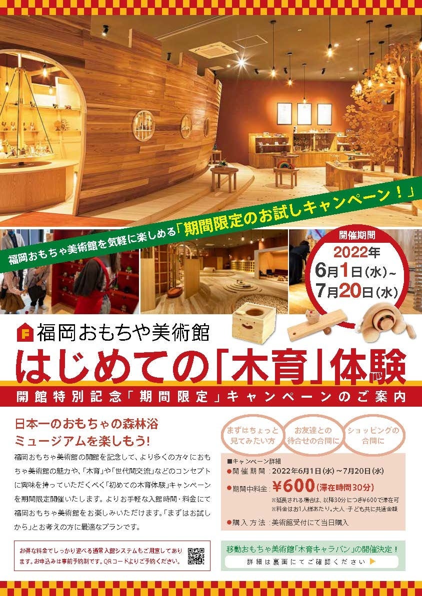 4月に開館した福岡おもちゃ美術館では、開館を記念した入館料半額キャンペーンを実施します。九州の木のぬくもりあふれる空間で、子どもも大人も心癒される時間をお届けします。