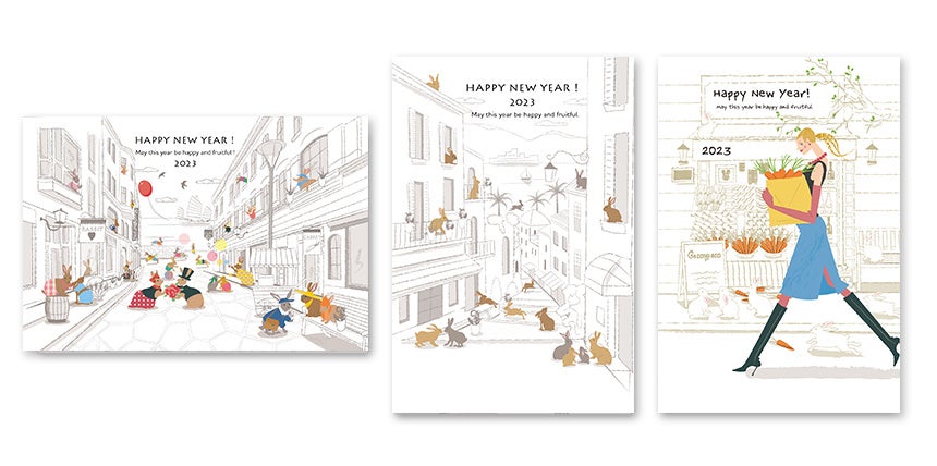 2012年のスタートから12度目の開催になる今回は、総勢45名のアーティストが描き下ろした100点以上のオリジナル「卯年」年賀状デザインを限定販売いたします。かわいいうさぎ、スタイリッシュなウサギ、キャラクター風、筆文字など、カラフルでユニークなイラストとデザインが勢揃い。年賀状デザインは最大で3色展開のカラーバリエーションがあり、豊富なラインナップからお好みの年賀状デザインをお選びいただけます。