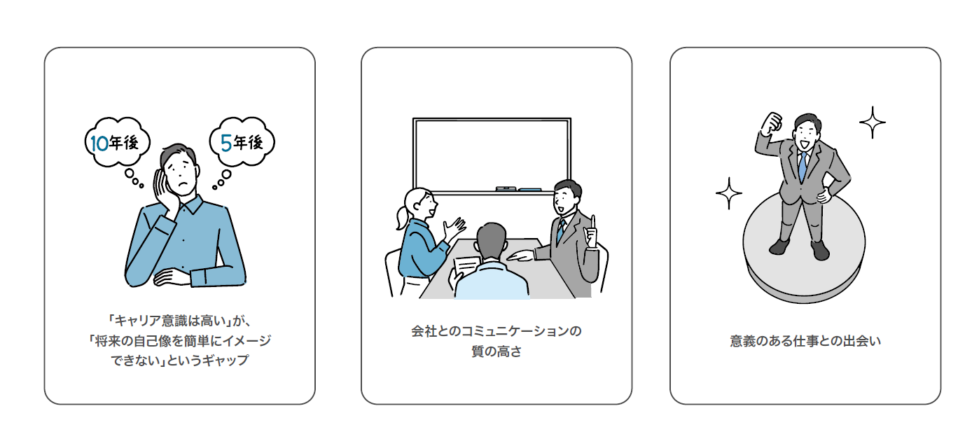 ここから、若手エンジニアの6割以上が「キャリアの自己決定意識」を高く持ちながら、その多くが「将来どうなりたいか、何をしていたいのかがわからない」、つまり意識と実態にギャップを抱えていることがわかりました。