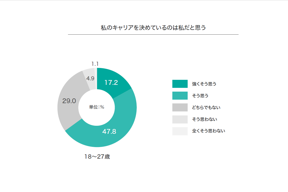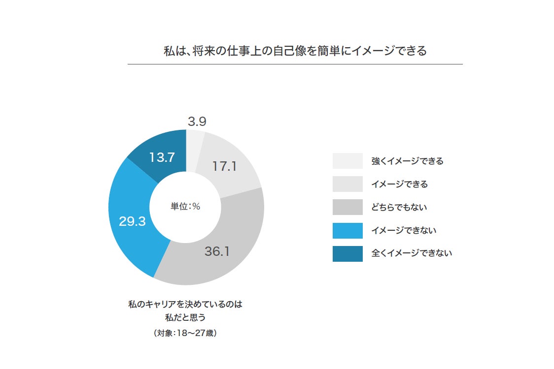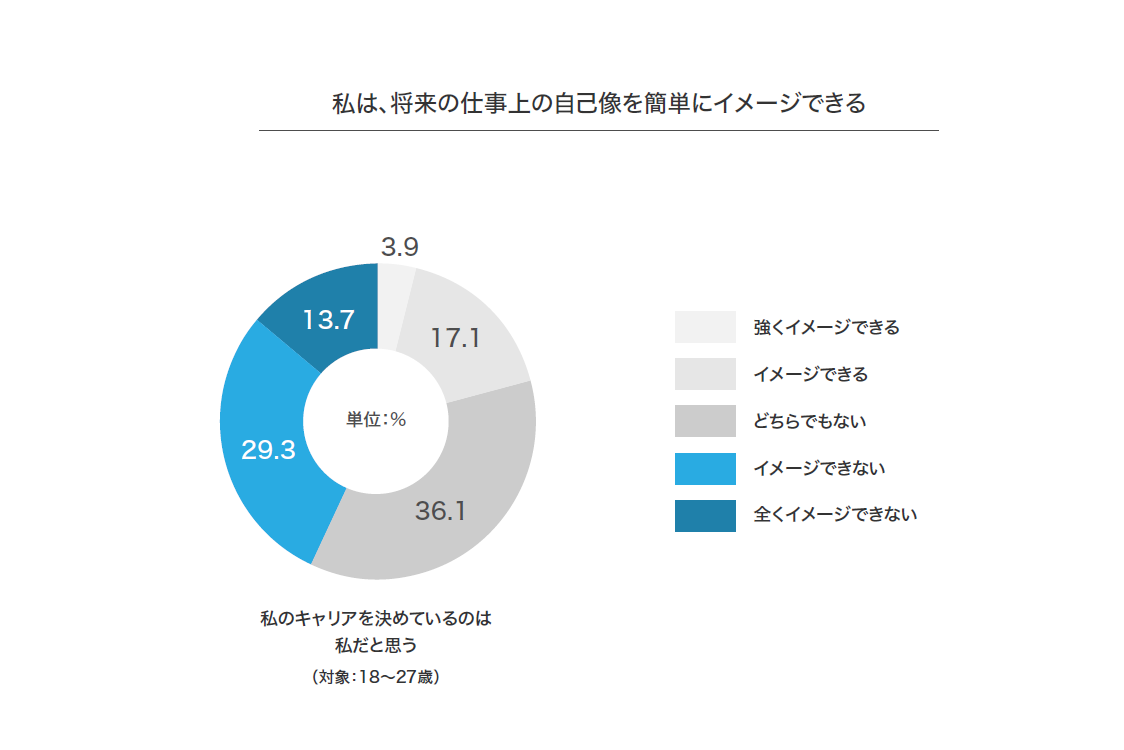 「自分のキャリアを決めているのは私だ」という質問項目に対し、若手(18歳~27歳)エンジニアの約65%が「そう思う」と回答。一方で、「そう思う」と回答した若手エンジニアのうち、43%が「将来の自己像を簡単にイメージできない」と答えています。