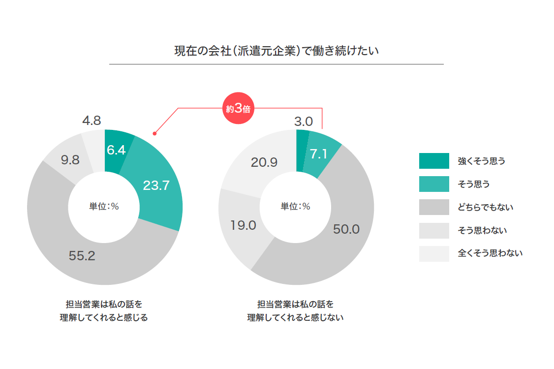 エンジニアとのコミュニケーション窓口の一つである担当営業の対応について調査しました。「担当営業は私の話を理解してくれると感じる」と思うエンジニアの、30.1%が「現在の会社(派遣元企業)で働き続けたい」と答え、「担当営業は私の話を理解してくれる」と感じていないエンジニアの約3 倍の結果となりました。