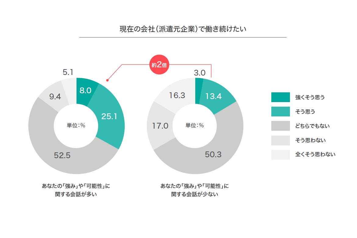 また、「あなたの『強み』や『可能性』に関する会話が多い」と思うエンジニアについても、33.1%が「現在の会社(派遣元企業)で働き続けたい」と答え、「『強み』や『可能性』に関する会話が多い」と思っていないエンジニアの約2 倍の結果となりました。