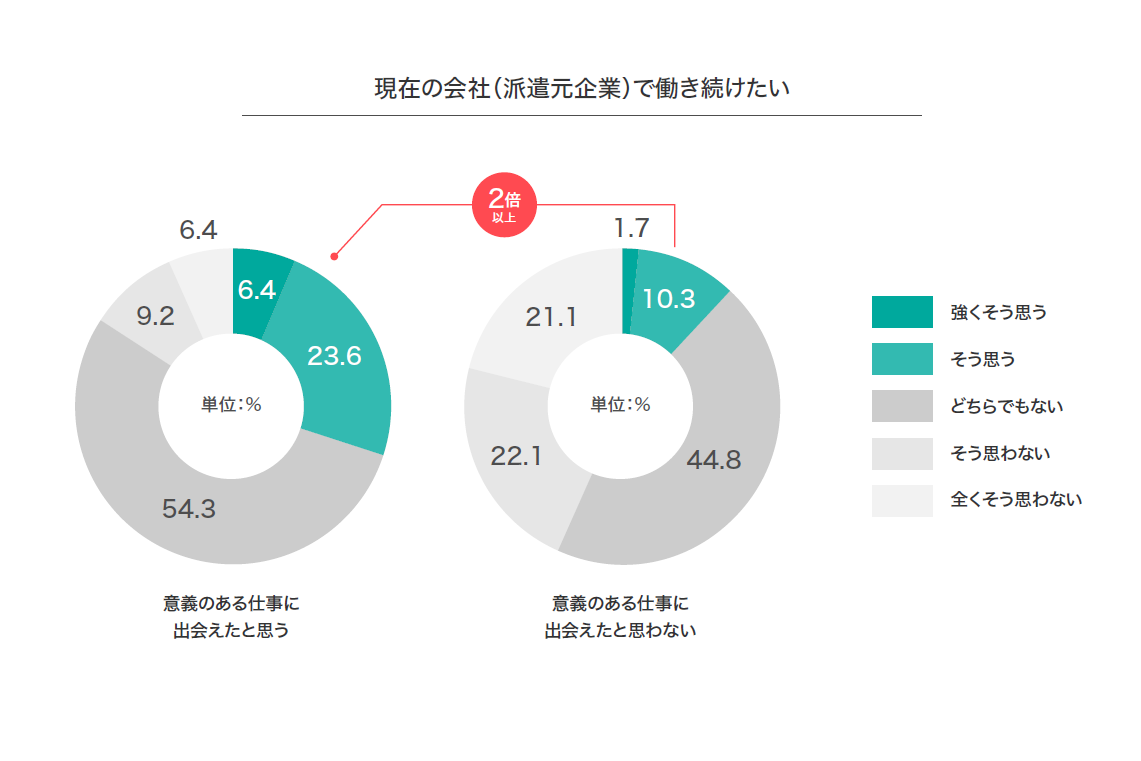 「意義のある仕事に出会えた」と思うエンジニアのうち30.0%が「現在の会社(派遣元企業)で働き続けたい」と回答しました。これは「意義のある仕事に出会えた」とは思っていないが、「現在の会社(派遣元企業)で働きたい」と答えたエンジニアの2 倍以上の数字です。
