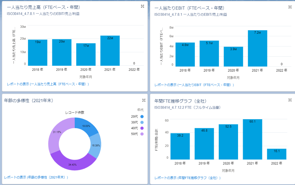 本レポートにはISO30414で中小企業に推奨されている項目に加え、当社のビジネス特性に基づいた独自項目など全22指標を3年度の期間で数値化し、当社人材戦略とともに開示しております。