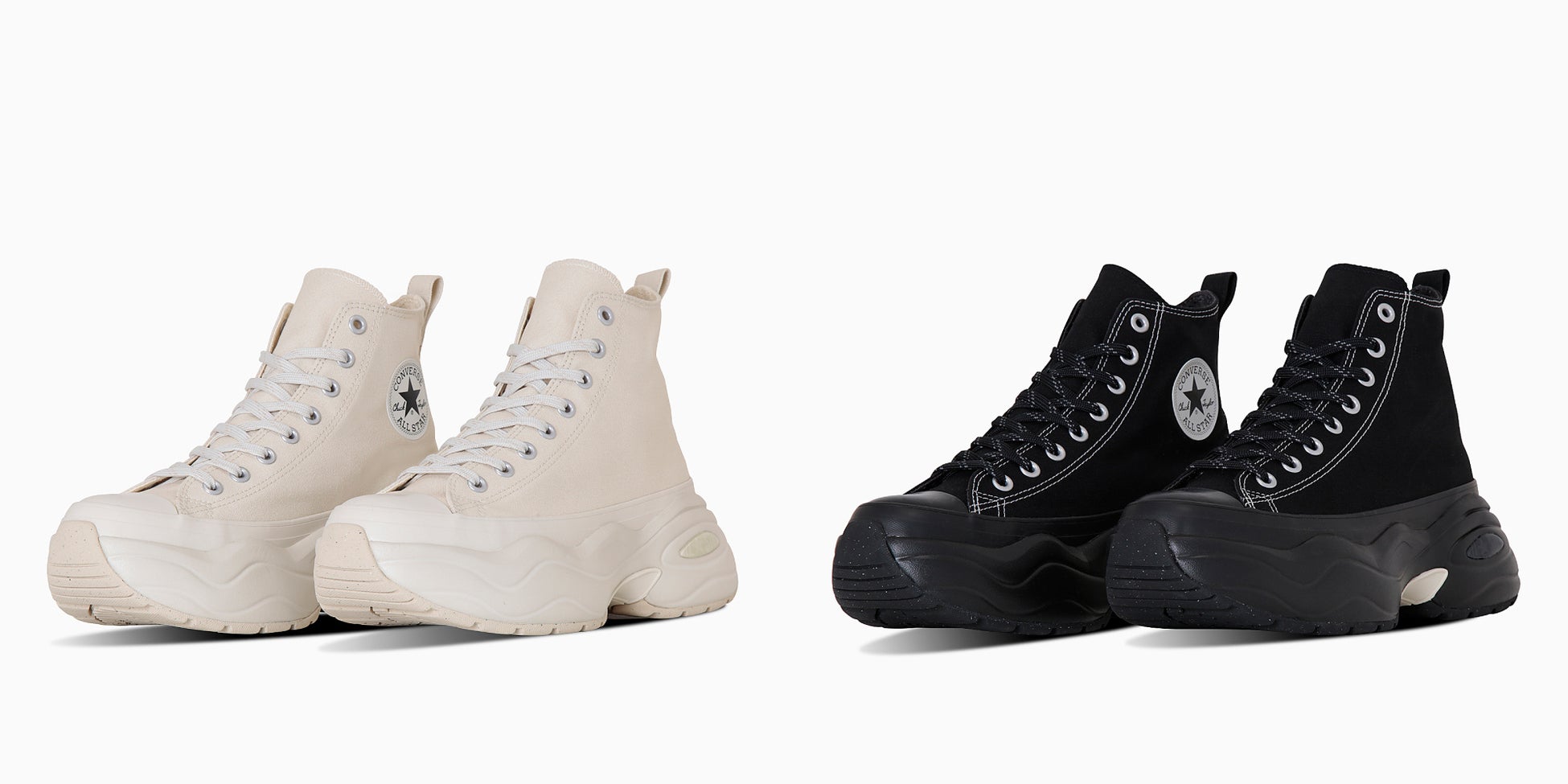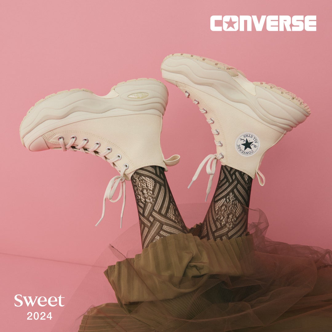 なこなこカップルが着用する〈ALL STAR Ⓡ SURGETRAINER〉はコンバースを代表するモデル「オールスター」に90年代のトレーニングシューズがモチーフのボリュームソールを掛け合わせた新たな厚底モデル。