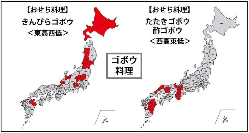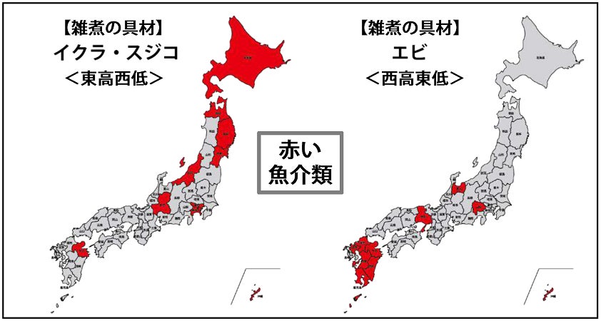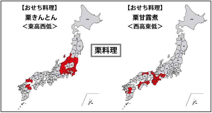 ここからは、調査を実施した50種類のおせち料理の用意率について、それぞれ上位10都道府県を算出、地図化して、東西に分かれるなどの特徴を持つおせち料理を選んで比較してみました。