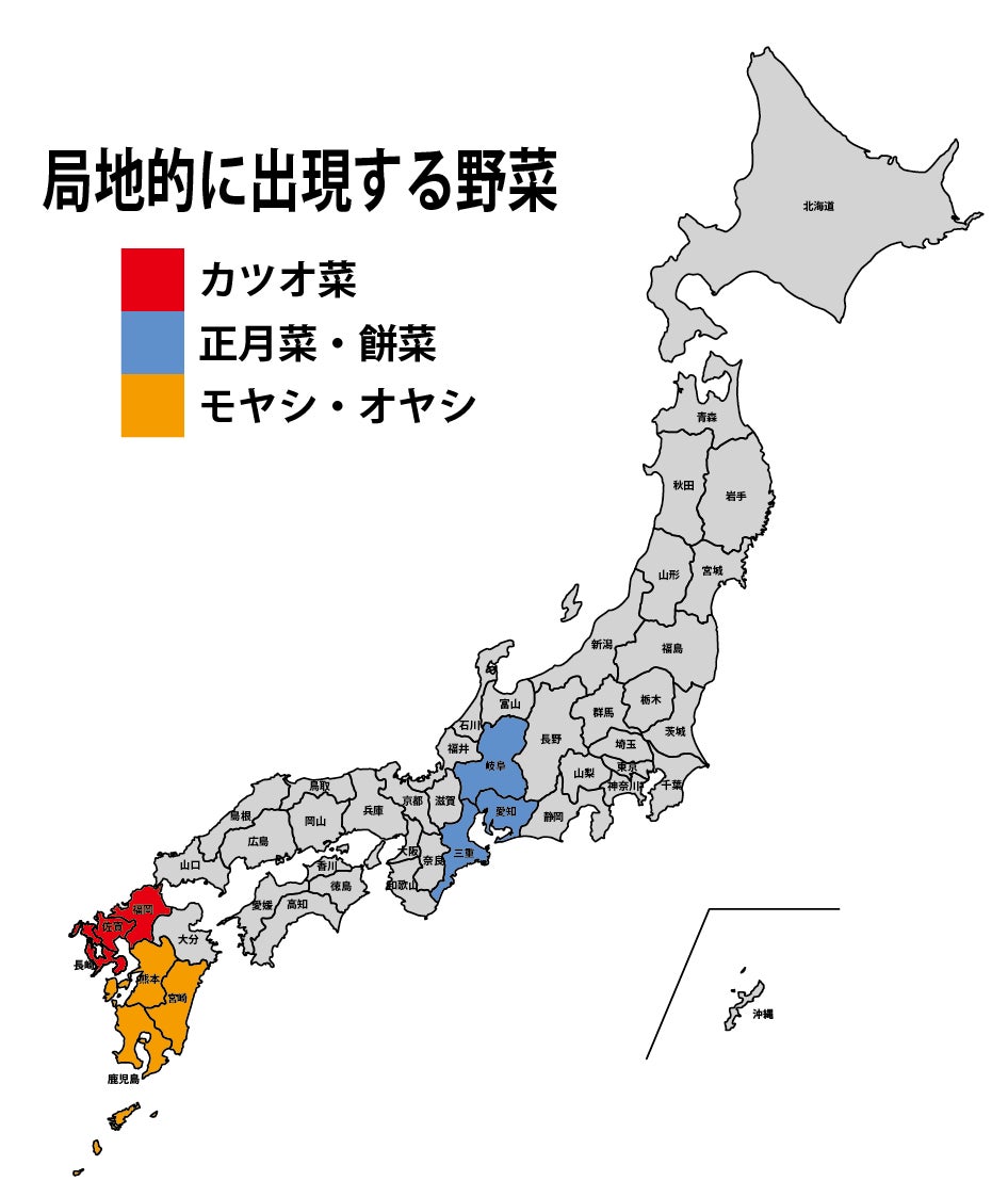 これ以外にご当地ならではの葉茎菜類として、26位に東海エリアを中心に食される「正月菜・(餅菜)」、33位に北九州を中心に食される「カツオ菜」、41位に南九州を中心に食される「モヤシ・オヤシ(長いモヤシ)」などがあり、なかでも熊本の水前寺モヤシなどが有名です。