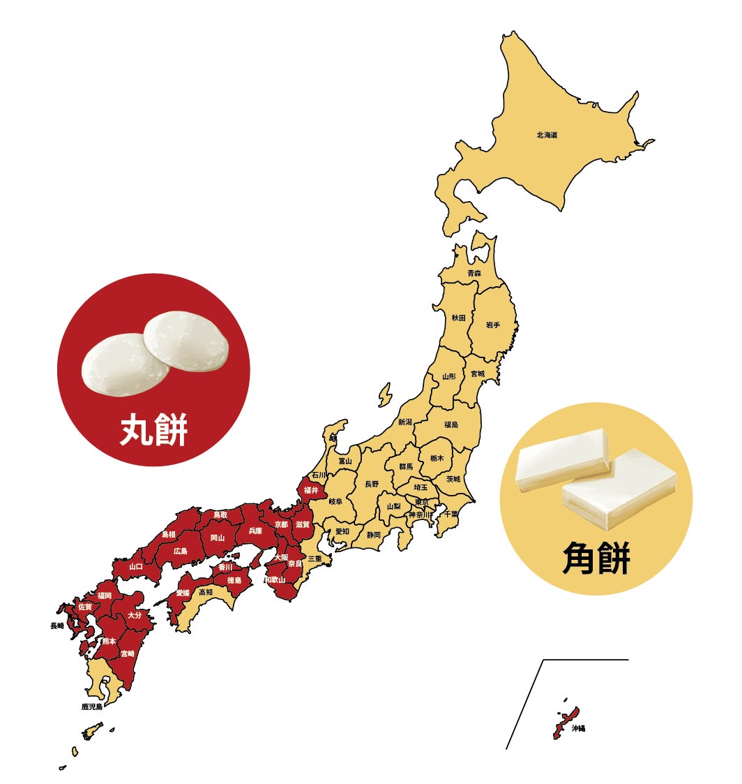 正月に自宅で食べる雑煮の餅の種類を聞いたところ、東日本は角餅、西日本の高知と鹿児島以外は丸餅という