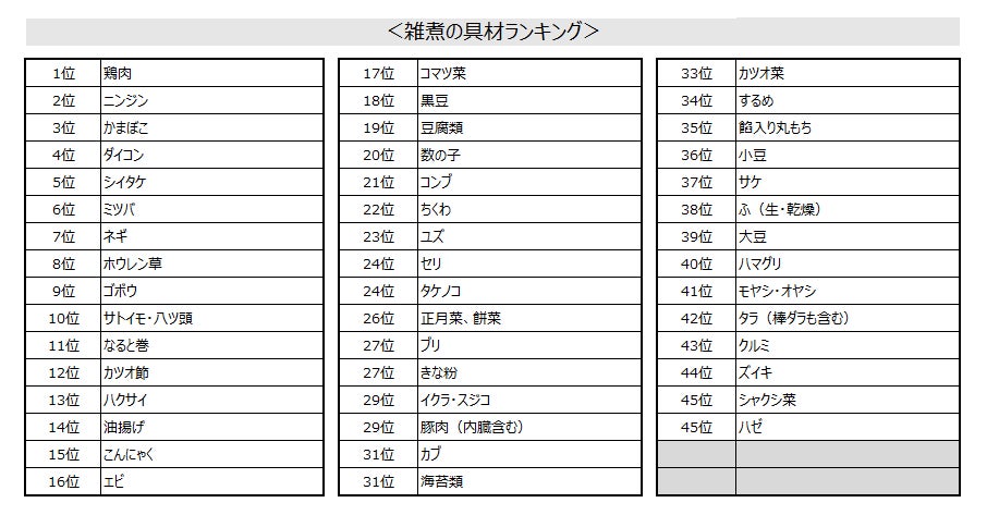 雑煮に入れる具材のベスト20には、野菜では根菜類としてニンジン・ダイコン・ゴボウ・サトイモ(八ツ頭)、葉茎菜類としてミツバ・ネギ・ホウレン草・ハクサイ・コマツ菜、キノコ類としてシイタケがランクインします。