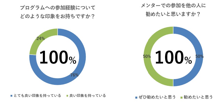2024年度『NPOメンタリングプログラム』で支援を受けたNPO等の代表と職員の全体的な満足度は100%。「他の人や他団体に勧めたいと思う」も100%の回答となりました。