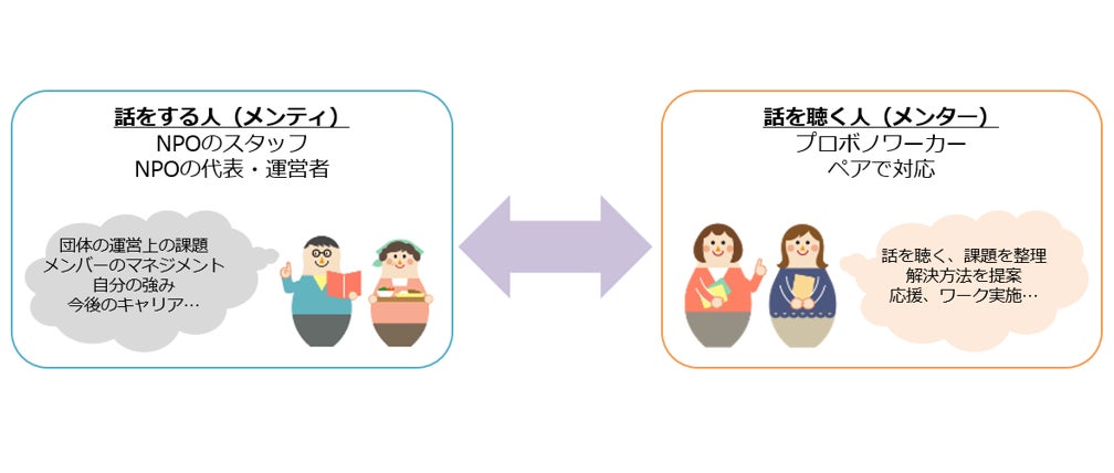 そこで、2022年から開始したNPOメンタリングプログラムでは、NPO等のスタッフや代表に、プロボノワーカー(プロボノ活動を行う社会人)が、外部のメンターとして月2回、3カ月間にわたって伴走。個々の業務やキャリアについての悩みを聴きながら課題を整理し、次の一歩を共に考えることで、モチベーションを維持・向上させ、受益者に対するポジティブな対応と継続的な活動の実現につなげてきました。本プログラムを通じて、支援者の孤独感や疲弊からくるバーンアウトを防ぎ、NPO運営の基盤強化につなげます。