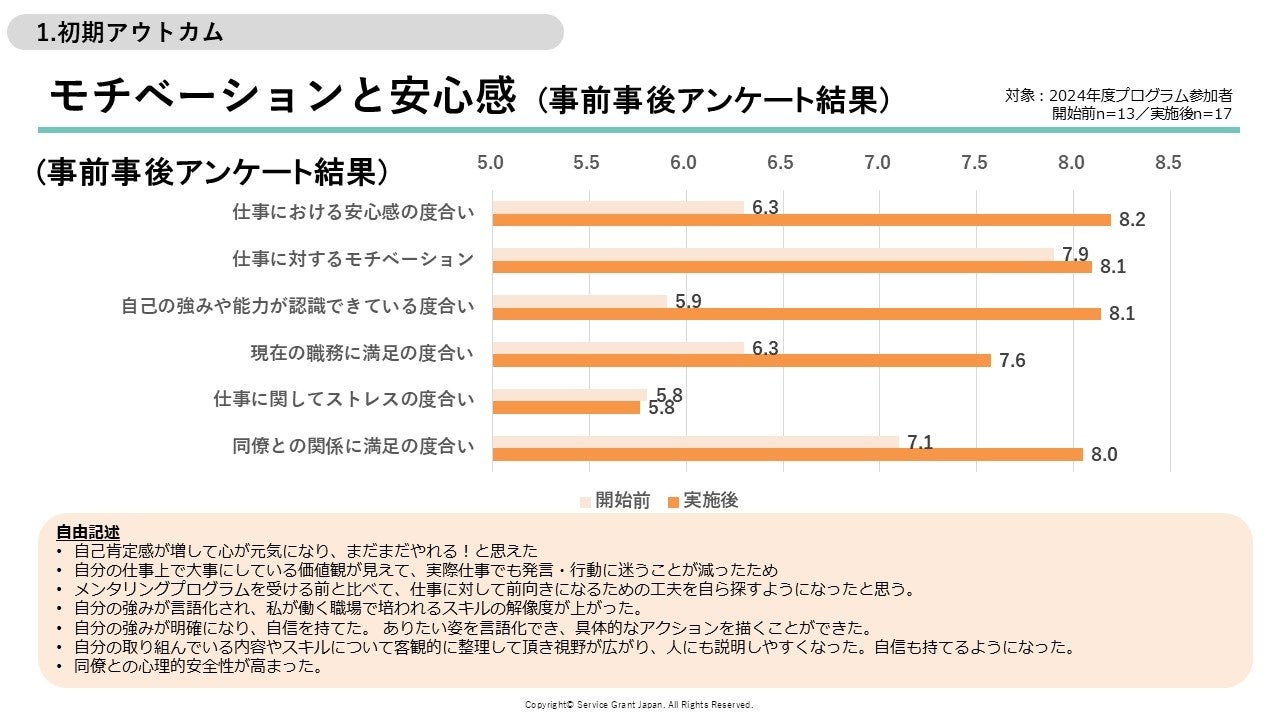 また、支援前後の参加者の状態を比較すると、「自己の強みや能力が認識できている度合い」が最もポジティブな変化が大きく、次いで「仕事における安心感の度合い」「現在の職務への満足の度合い」「同僚との関係への満足の度合い」も大きな変化が見られます。これは、自身の強みや、活動の意義を第三者に言語化してもらい再認識できた、整理できたことによるものと考えられます。各項目が相乗効果で活動への前向きな影響を及ぼしていることがうかがえます。