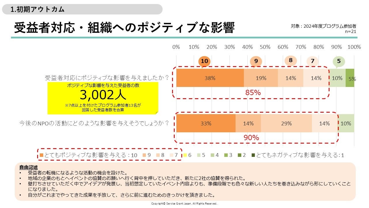 支援を受けたことによる今後の活動への影響は、90%が「ポジティブな影響を与える」と回答。団体が活動の対象としている支援を必要とする人(受益者)への対応にポジティブな影響を与えましたか? という質問には、85%が「ポジティブな影響を与える」と回答しました。支援の結果、ポジティブな影響を与えた受益者は3002人※に上ることがわかりました。