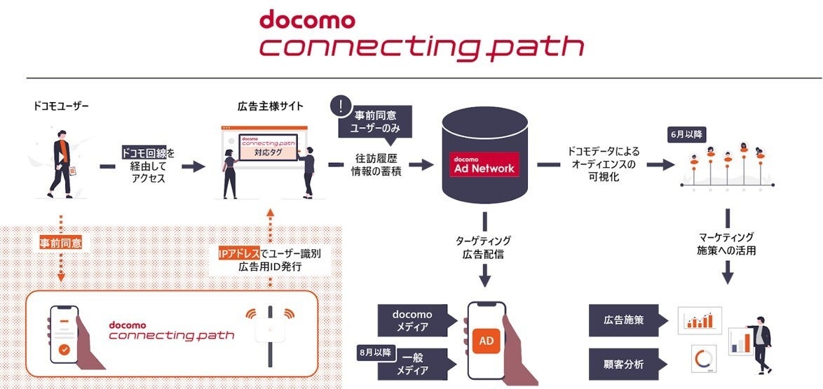 docomo connecting path(通称「コネパス」)は、お客さまからの事前同意のもと、お客さまがご契約のドコモの通信回線で各種サイトやアプリ※2を利用した際にドコモが発行するIPアドレス等を用いて、ユーザー識別を可能にする、お客さまのプライバシーに配慮した広告専用ID発行ソリューションです。本IDは、事前同意を得たゼロパーティーデータであり、Cookieレスのブラウザ(Safari等)を利用した際もユーザー同定が可能になります。「docomo Ad Network」では「コネパス」の機能を活用した広告主サイトでのオーディエンス情報の蓄積、ターゲティング広告配信と、コンバージョン計測に対応しています。