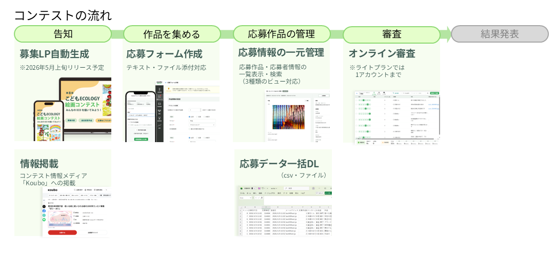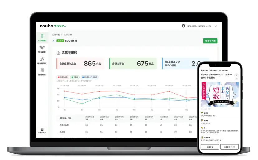 「Kouboプランナー」は、コンテスト・公募の募集告知から応募受付、審査、結果発表までをワンストップで完結できるSaaSプラットフォームです。