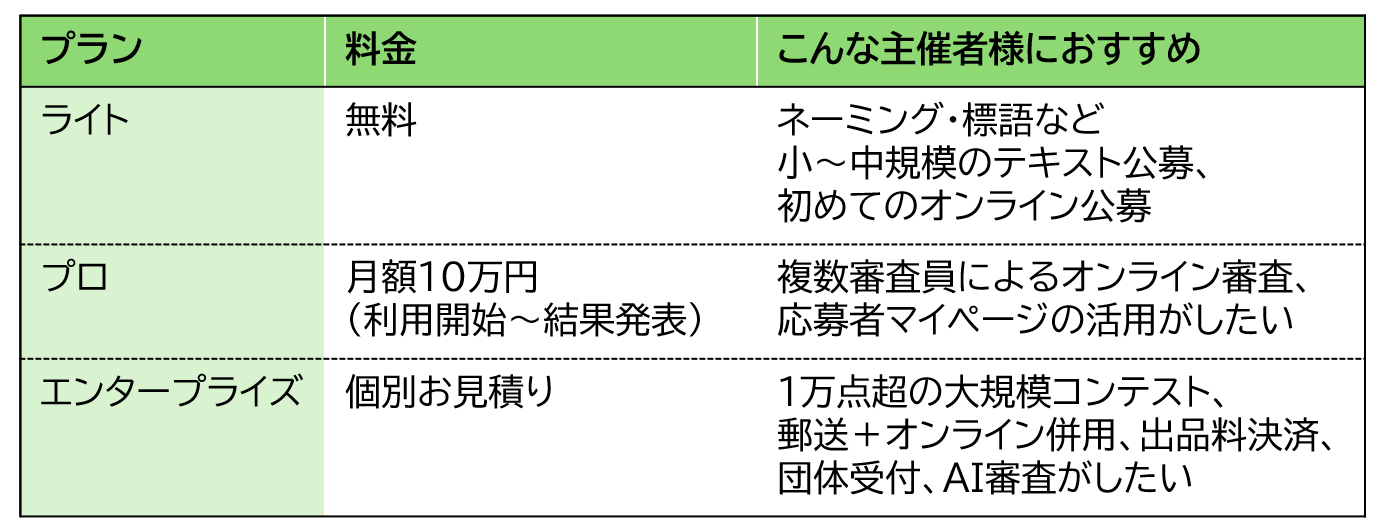 こうした課題を解消し、すべての主催者様がコンテスト運営のDXに取り組みやすい環境を整えるため、このたび料金体系を全面的に見直しました。