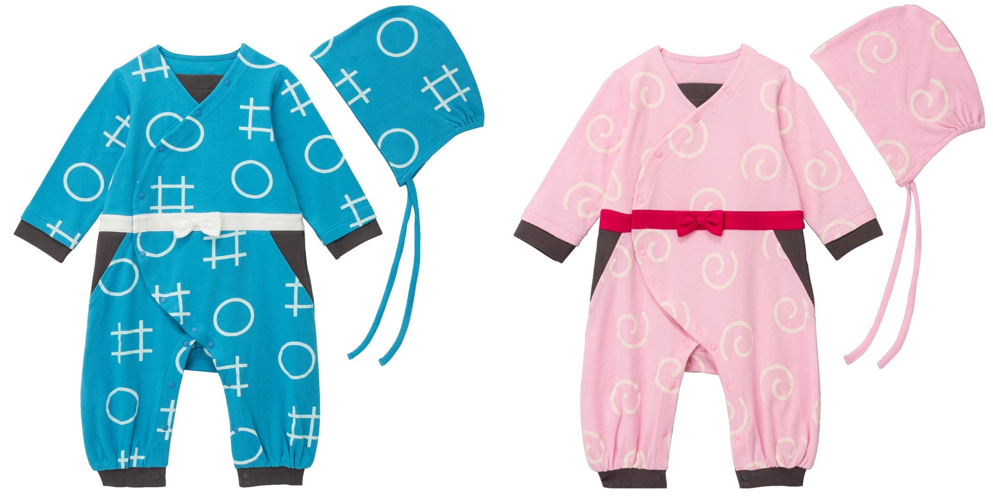●特徴/忍術学園の1年生が着る服の総柄モチーフ(ブルー)と、くの一の総柄モチーフ(ピンク)の2柄展開。お揃いの総柄ボンネット付きで、完璧になりきります