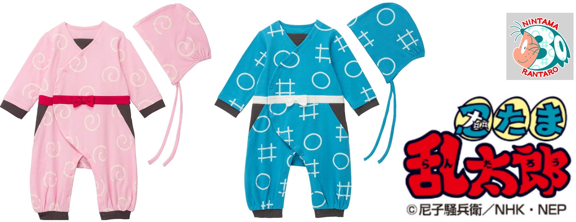商品は、乱太郎やきり丸、しんべヱ達になりきれる「忍たまになれる!総柄ロンパース&帽子セット」、「忍たまになれる!総柄トップス&ボトムセット」の他、「学園長になれる!レイヤード風ロンパース」、忍術学園の宿敵「稗田八方斎になれる!レイヤード風ロンパース」の全4種です。