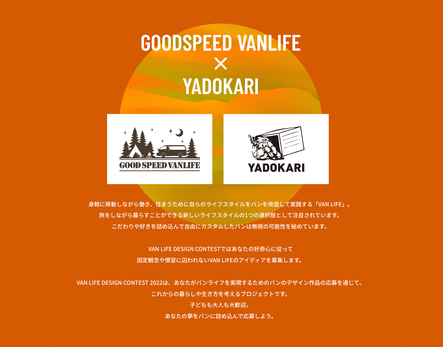 YADOKARI株式会社(本社:神奈川県横浜市/代表取締役CEO:さわだいっせい、代表取締役COO:上杉勢太、以下「YADOKARI」)は、東海エリアにおける2021年度 SUV 販売台数6,000台以上の株式会社グッドスピード(本社:愛知県名古屋市/代表取締役社長:加藤久統、証券コード:7676、東証グロース、以下「グッドスピード」)との協働の下、グッドスピードのキャンピングカー専門店「GOODSPEED VANLIFE 春日井店(愛知県春日井市)」の新ショールームのオープンに合わせ、「VANLIFE DESIGN CONTEST 2022」を開催いたします。身軽に移動しながら働き、住まうライフスタイルとして両社が提案する「バンライフ」をより多く人に届け、可能性を広げるプロモーション企画として、タイニーハウスやバンを使った様々なイベントを手掛けてきたYADOKARIが初めて、バンライフを実現するための車両のデザイン応募を通じて、これからの暮らしや生き方を考えるプロジェクトとして応募作品を募集します。