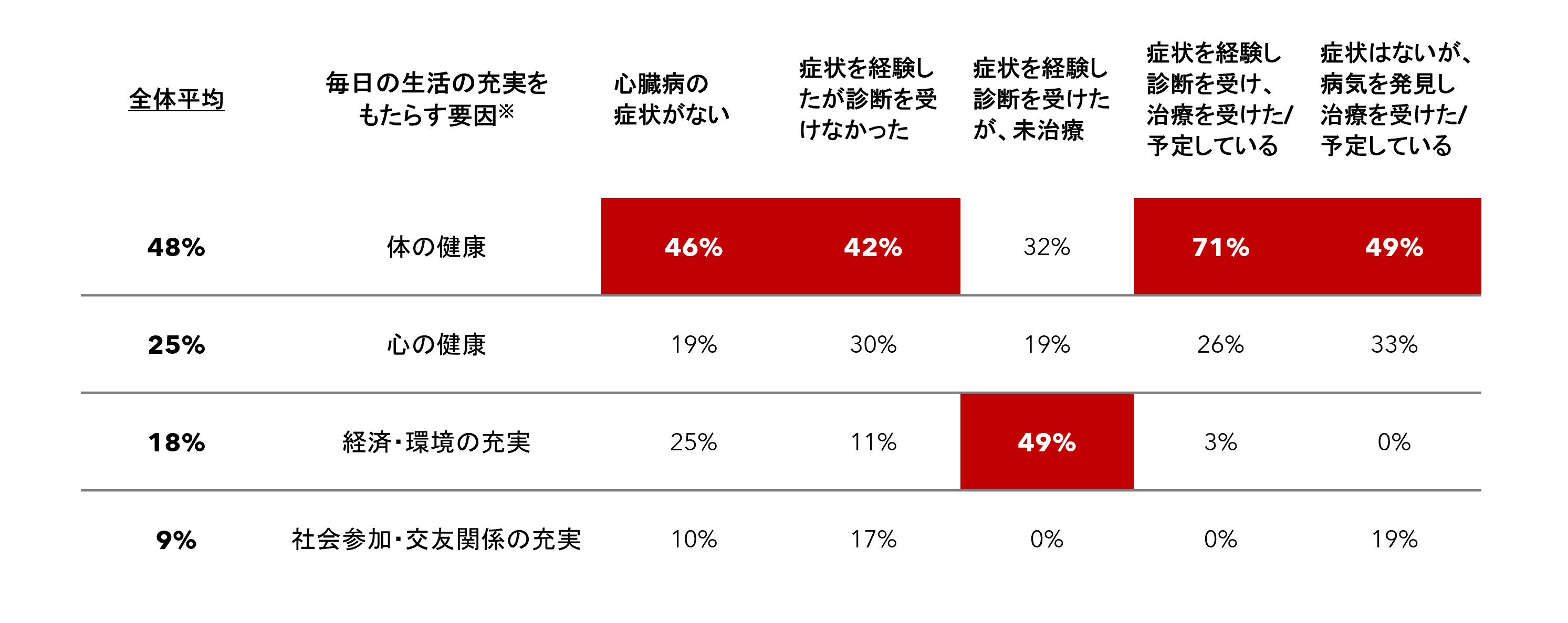 調査の結果、「心臓病の診断を受けたが、未治療」の回答者グループを除いた、4つのグループ全てで「体の健康」が生活の充実にとって最も重要な要因でした。