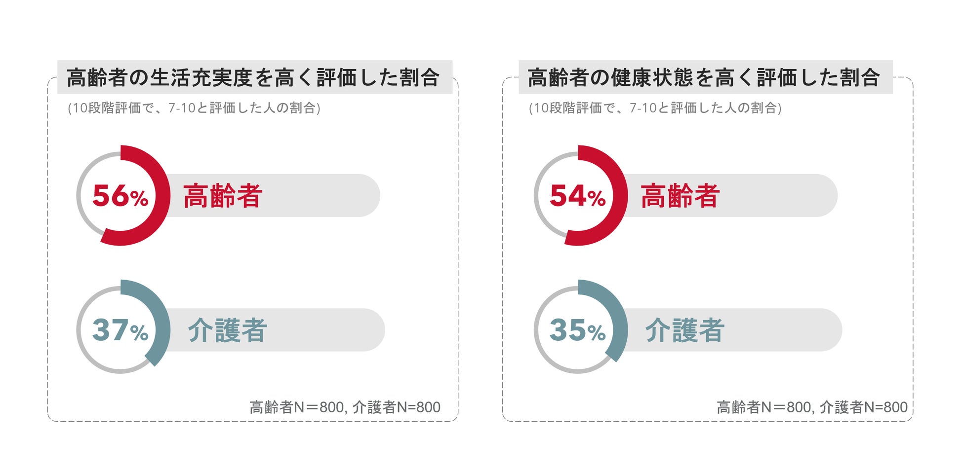 o 本調査では、高齢者は自分自身、介護者は自分が主に介護する高齢者の、生活の充実度および健康状態を10段階のスケール(「1」=最もよくない~「10」=最も良好)で評価した結果に基づき、7~10と高く評価した回答者の割合を計算しました。