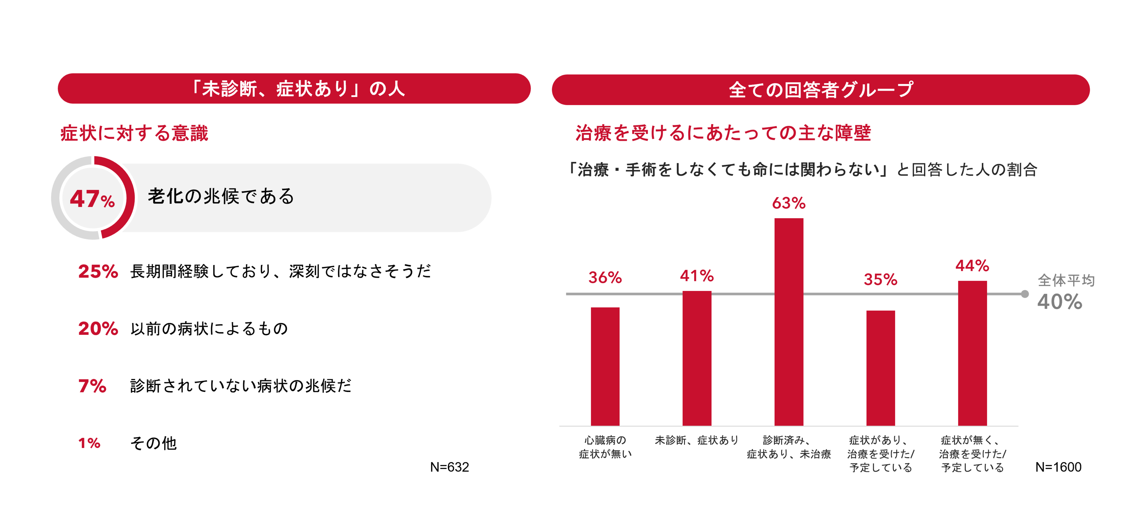 o 「心臓病のような症状があるが、未診断」の高齢者およびその介護者の47%は、症状を「老化の兆候」と考えています。また、治療を受けている人でも、49%が「症状が日常生活に影響を及ぼし始めてから治療を受けた」と回答しており、病状が進行してからの受診となっていることがうかがえます。このことから、高齢者は自身の症状を軽視してしまい、適切なタイミングでの診断や治療を受けられていない可能性があります。
