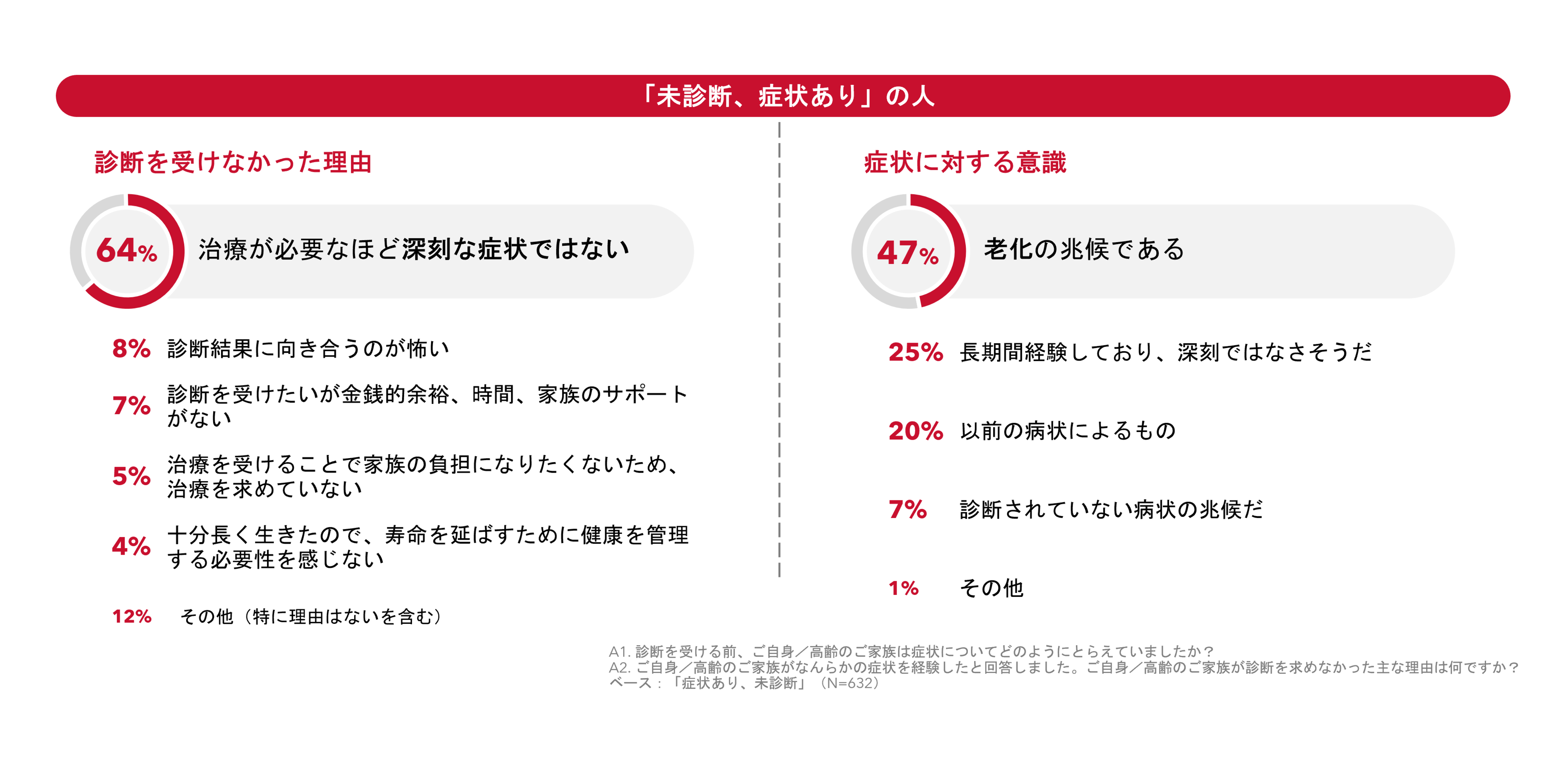 症状があり診断を受けていない高齢者の64%は、診断を受けない理由として「治療が必要なほど深刻な症状ではない」ことを挙げています。また、47%は症状に対して「老化の兆候である」と考えています。このことから、高齢者は自身の症状を軽視してしまい、適切なタイミングでの診断や治療を受けられていない可能性があります。