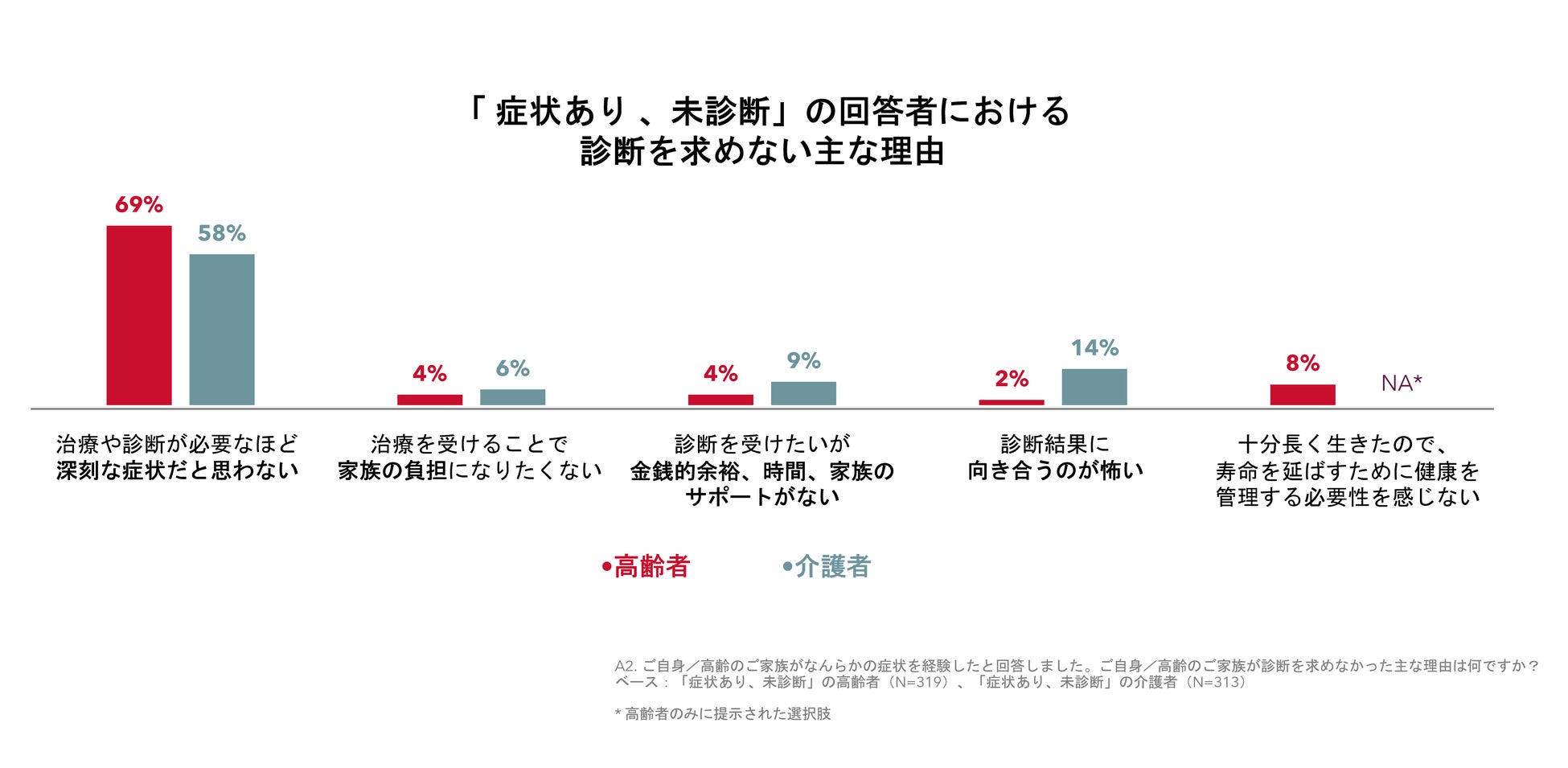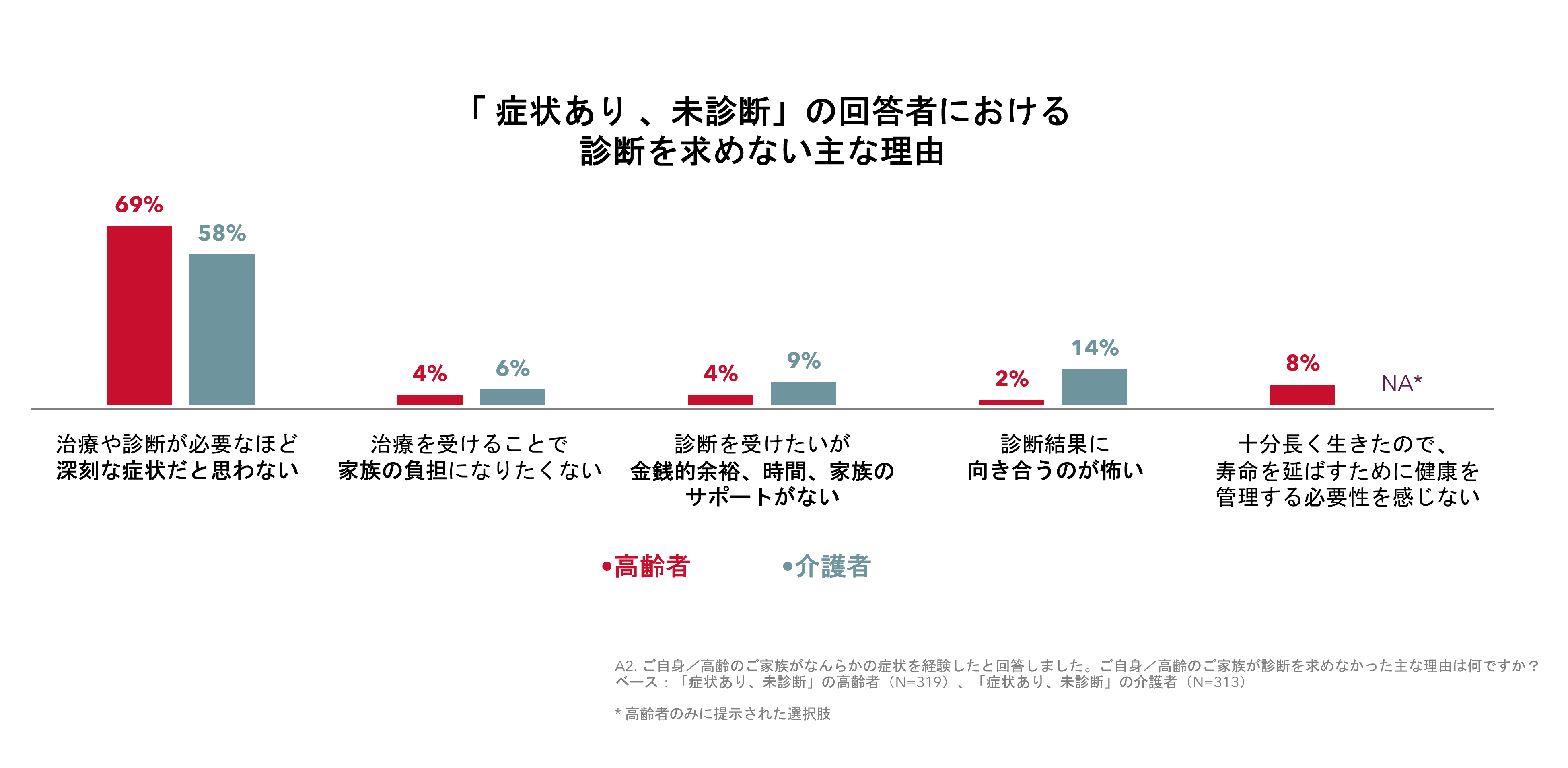 高齢者、介護者ともに、症状が診断や治療を必要とするほど深刻だと感じていないことが、診断を求めない理由のトップとなっています。