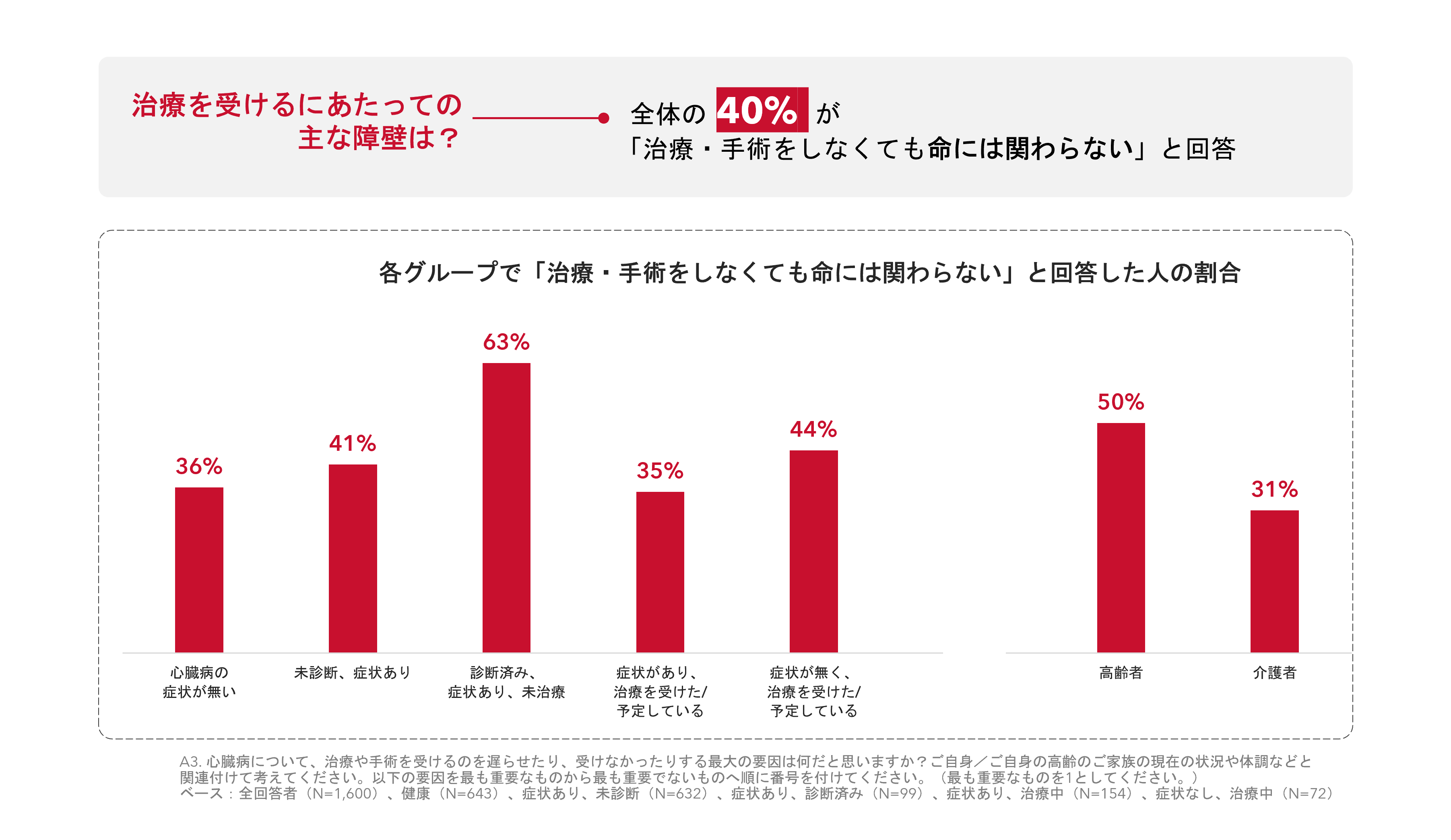 o 「症状があり、診断を受けたが、未治療」の高齢者は「治療・手術をしなくても命には関わらない」と考える人の割合が最も多く、全体平均40%に対し63%にのぼります。心臓病は日本人の死因の第2位(1)であるにもかかわらず、治療の重要性を深刻にとらえていない可能性があります。