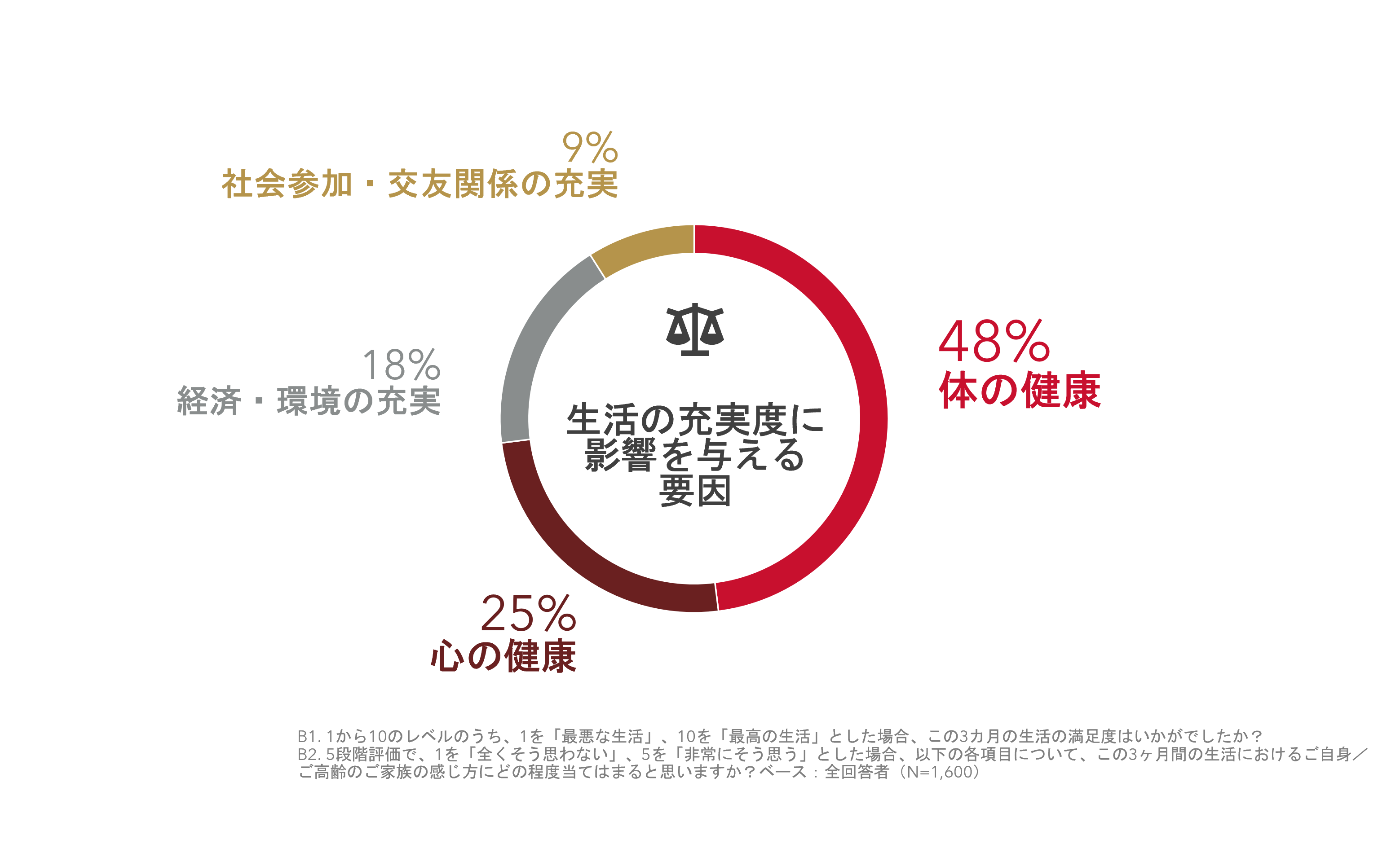 生活充実度に最も影響を与える要因は「体の健康」で、全体の平均は48%となりました。